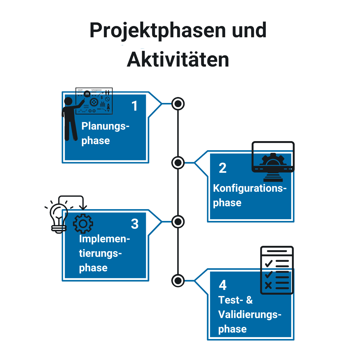 - Projektphasen: Planung, Konfiguration, Implementierung, Schulung, Übergang usw.